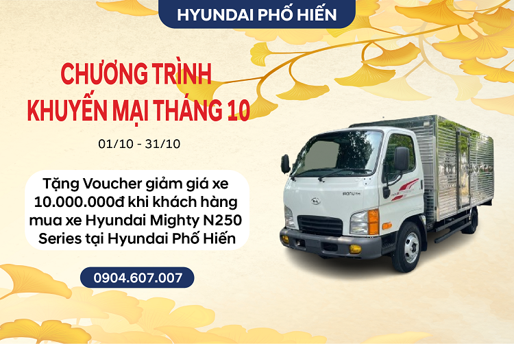 Tặng VOUCHER giảm giá 10 triệu khi mua xe Hyundai Mighty N250 Series tại Hyundai Phố Hiến từ 01/10/2024 - 31/10/2024