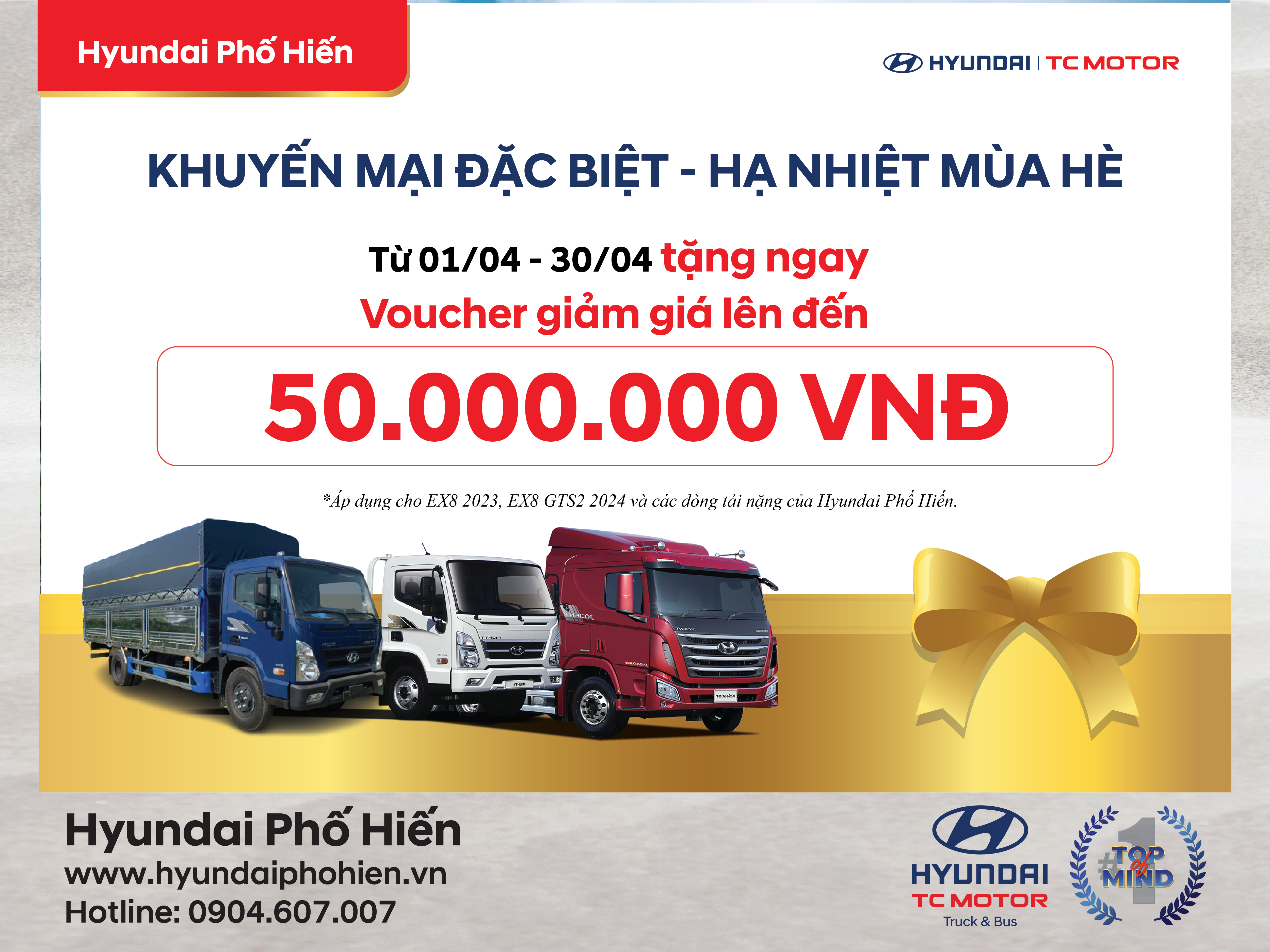 Từ 01/04 đến 30/04/2024 tặng ngay Voucher giảm giá lên đến 50.000.000 VNĐ khi mua dòng xe EX8 và các dòng tải nặng tại Hyundai Phố Hiến