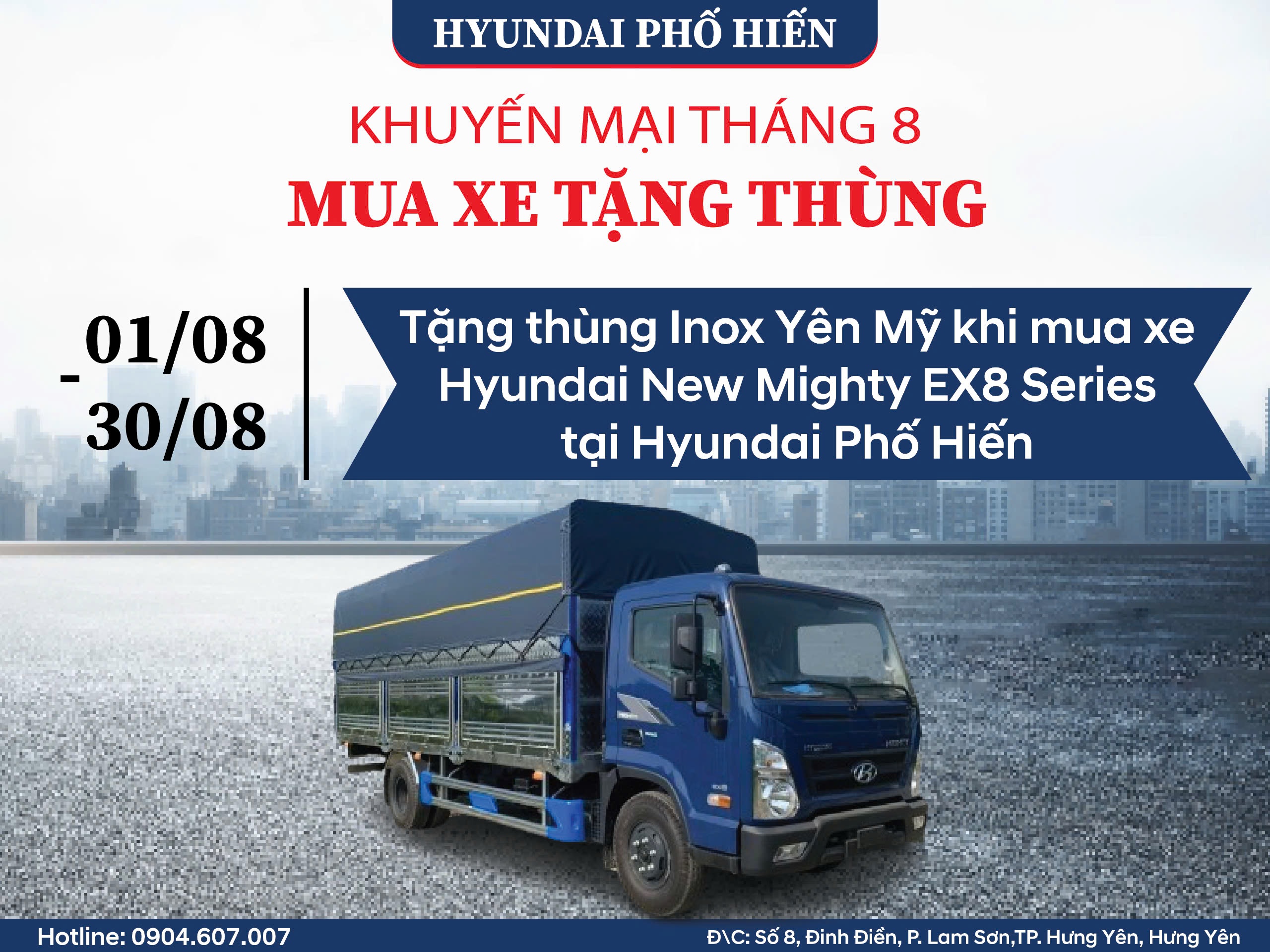 ✨Mua xe tặng thùng Yên Mỹ trị giá lên đến 70 triệu cho khách hàng mua xe Hyundai New Mighty EX8 Series tại Hyundai Phố Hiến từ 01/08/2024 - 31/08/2024