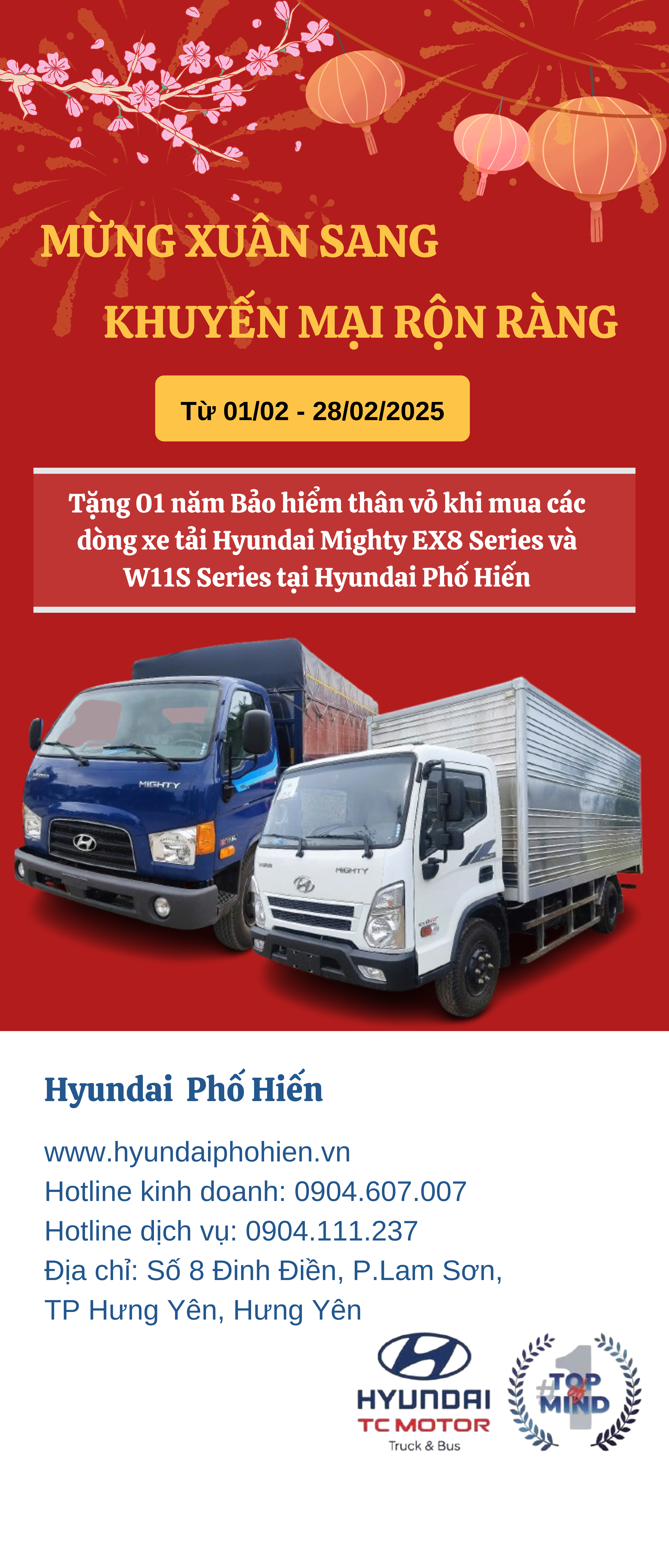 * Tặng 01 năm Bảo hiểm thân vỏ khi mua các dòng xe tải Hyundai Mighty EX8 Series và W11S Series tại Hyundai Phố Hiến.