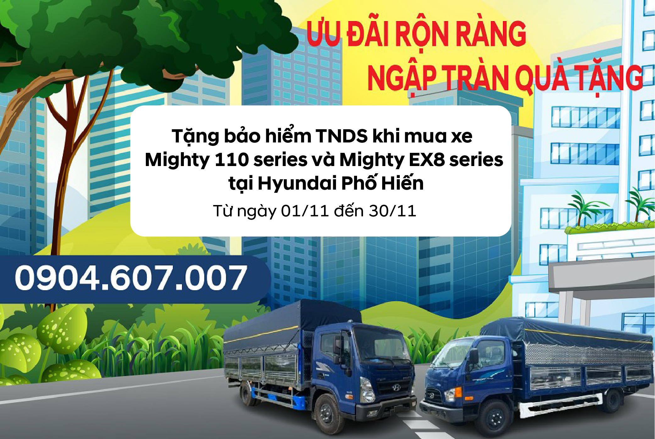 * Tặng bảo hiểm TNDS khi mua xe Mighty 110 series và Mighty EX8 series tại Hyundai Phố Hiến tại Hyundai Phố Hiến từ 01/11/2024 - 30/11/2024